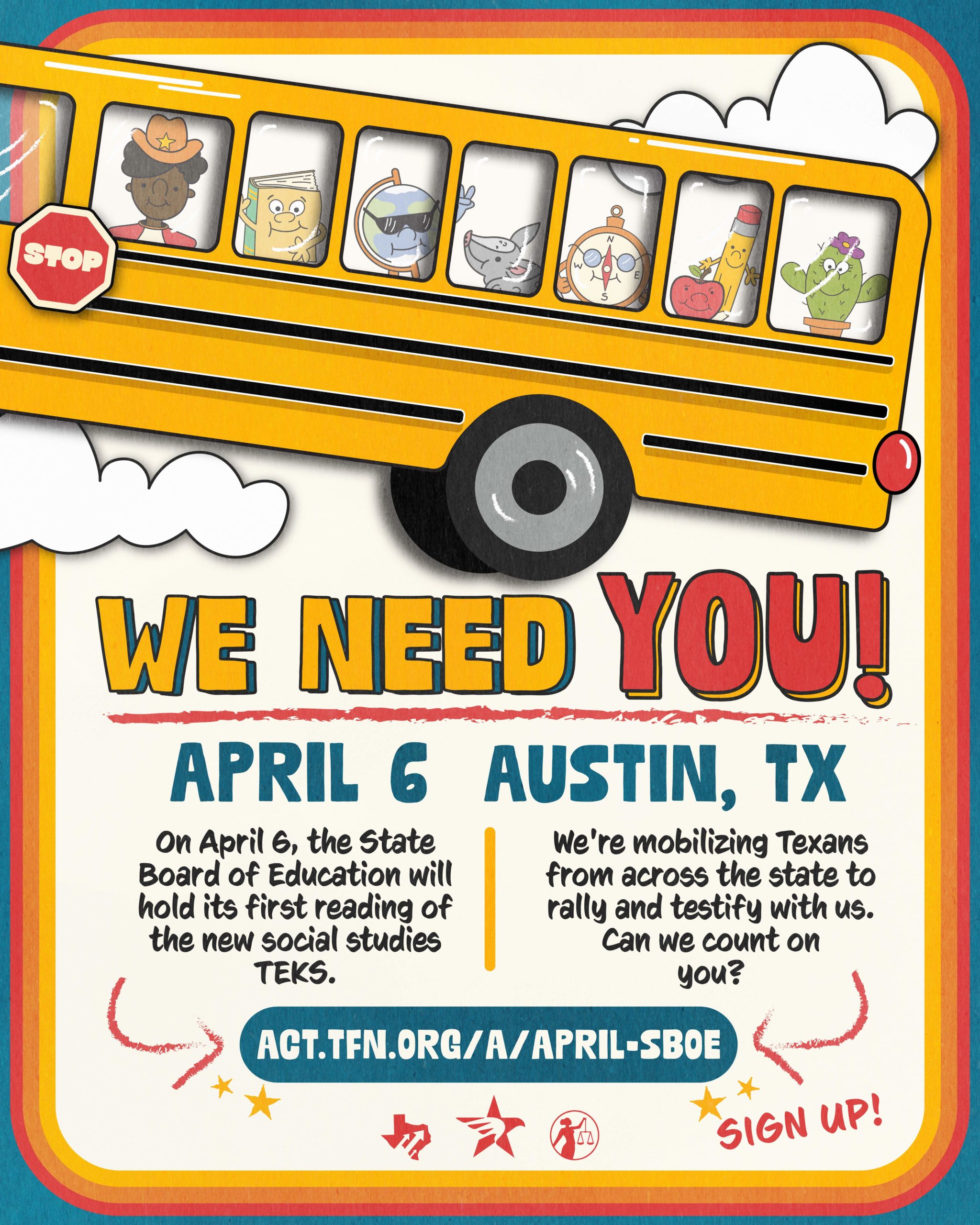 TFN and our Teach the Truth partners are mobilizing Texans from across the state to rally, testify, and make clear that our communities are watching. This April 6 meeting is the most critical moment for community input. Can you be there?