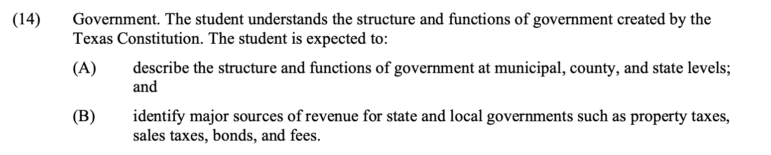 As an example, here’s one of 23 items in the 7th grade social studies TEKS: